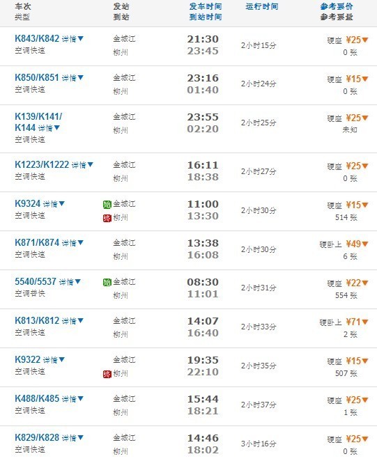 K811 / K814 柳州 - 金城江 09:31 - 当天 11:41 空调快速 2小时10分 161公里 硬座 25 硬卧下 79 软座 40 软卧下 115 查询余票